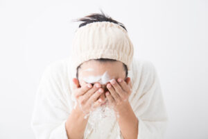 30〜35℃程度のぬるま湯で、洗顔料が残らないようにしっかりとすすぎましょう。